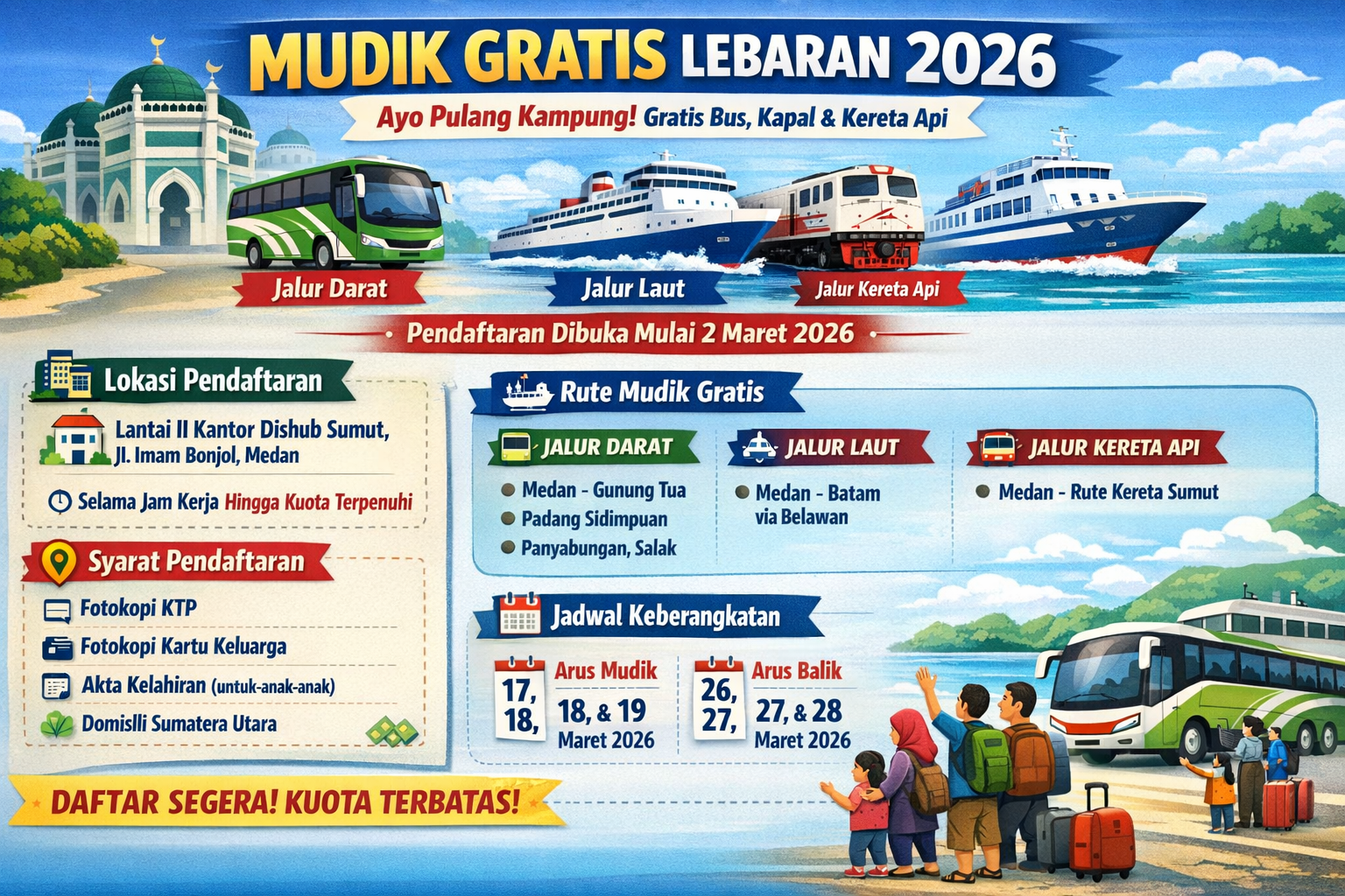 MEDAN – Pemerintah Provinsi Sumatera Utara (Pemprov Sumut) kembali menghadirkan program Mudik Gratis untuk menyambut Hari Raya Idul Fitri 1447 H / Lebaran 2026. Program ini dirancang khusus untuk membantu pekerja, mahasiswa, dan keluarga kurang mampu agar dapat pulang kampung dengan aman tanpa beban biaya transportasi.